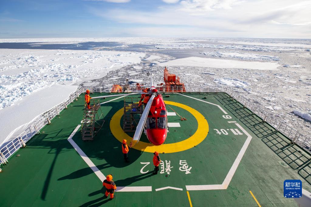 12月5日,“雪龙2”号船载直升机正准备起飞了解前方冰情。新华社记者 周圆 摄