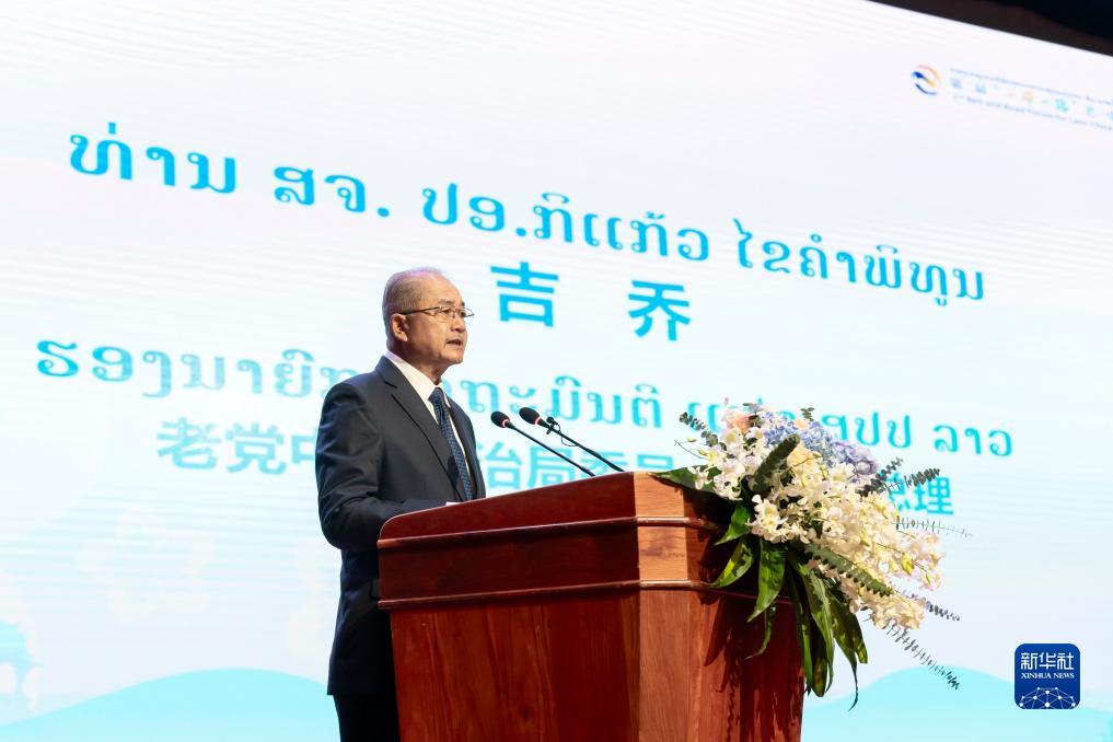 12月7日,在老挝首都万象,老挝副总理吉乔在第二届“一带一路”老—中合作论坛上致辞。新华社记者 朱炜 摄