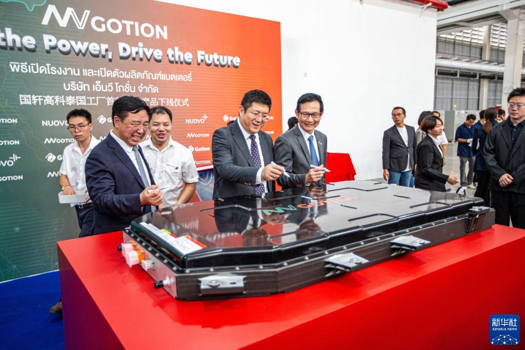 12月7日,在泰国罗勇府暹罗东方工业园,与会嘉宾为国轩高科泰国工厂首款电池产品签名留念。新华社记者 王腾 摄