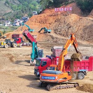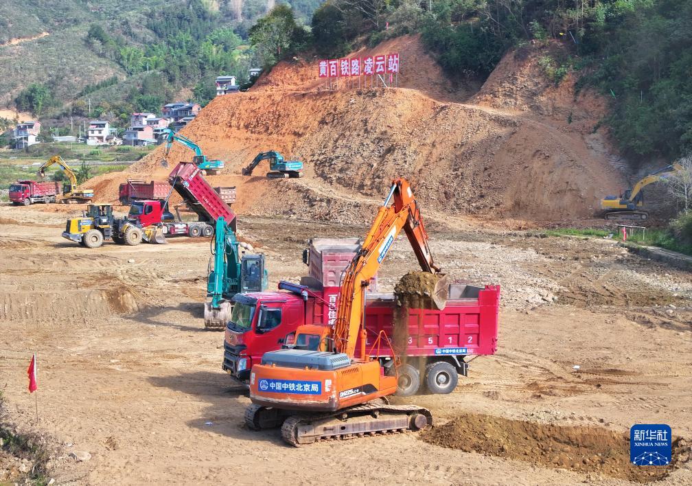 12月8日,工程车辆在黄百铁路凌云站施工。新华社记者 周华 摄