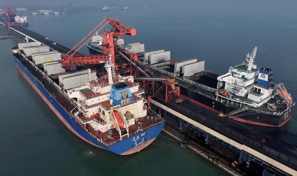 12月5日,两艘轮船靠泊在唐山港曹妃甸港区国投曹妃甸港口有限公司煤炭码头装货(无人机照片)。新华社记者杨世尧摄