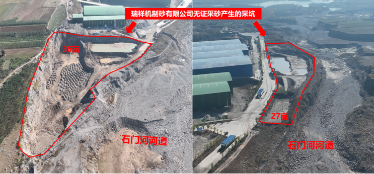 经核查,这两个采坑面积分别约为36亩和27亩,其中,约19亩和20亩为此河段被划定为禁采区以后新增开采形成。