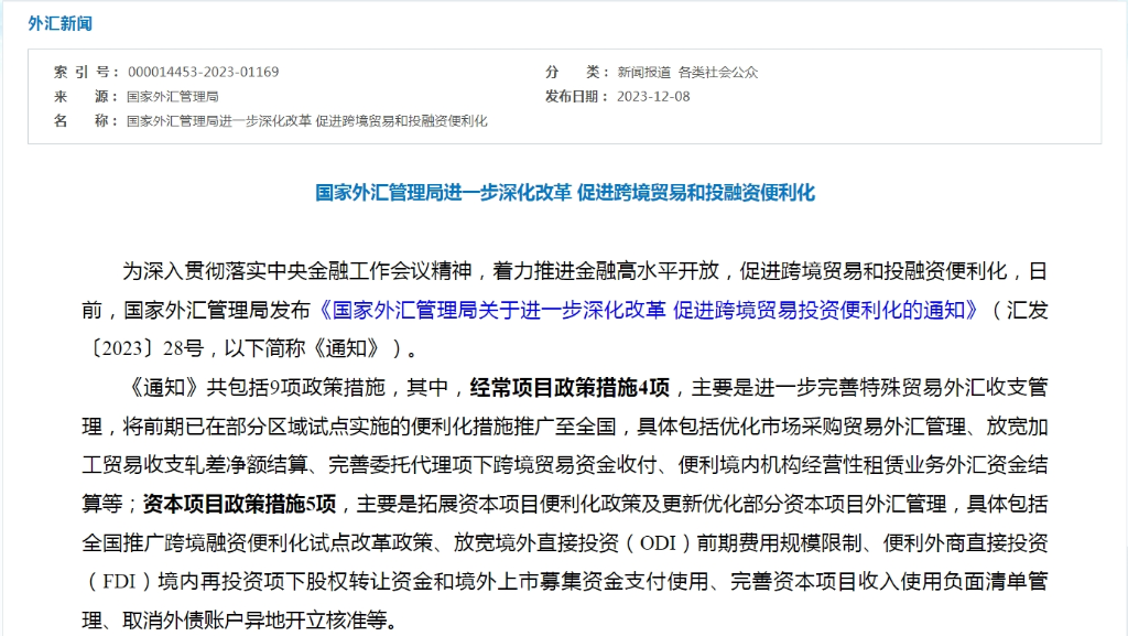 新华社北京12月8日电(记者刘开雄)国家外汇管理局8日发布通知,着力推进金融高水平开放,促进跨境贸易和投融资便利化。该通知共包括9项政策措施,其中,经常项目政策措施4项,资本项目政策措施5项。