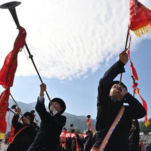 瑶族群众在黄桶至百色铁路建设动员大会上吹响瑶族长号。新华社记者周华 摄