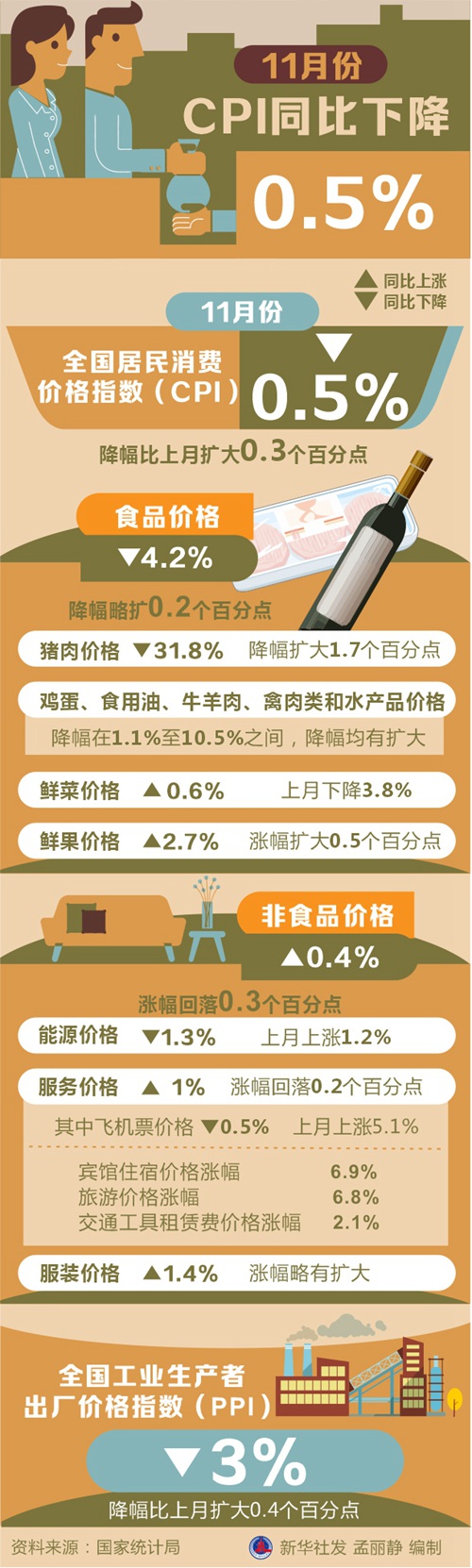 新华社北京12月9日电(记者魏玉坤)国家统计局9日发布的数据显示,11月份,全国居民消费价格指数(CPI)同比下降0.5%,降幅比上月扩大0.3个百分点;环比下降0.5%。