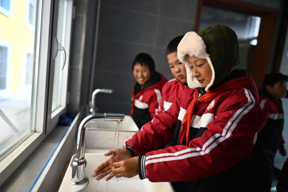 在青海省果洛藏族自治州玛多县花石峡镇藏文中心寄宿制学校,五年级学生东桑(右一)在使用厕所后洗手,该学校是环境卫生特别项目学校之一(11月2日摄)。新华社记者 张宏祥 摄