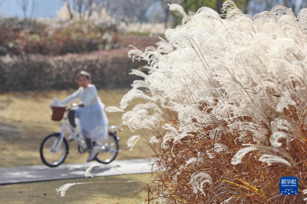 12月9日,小朋友在浙江省嘉兴市一处公园内骑行。