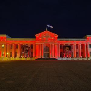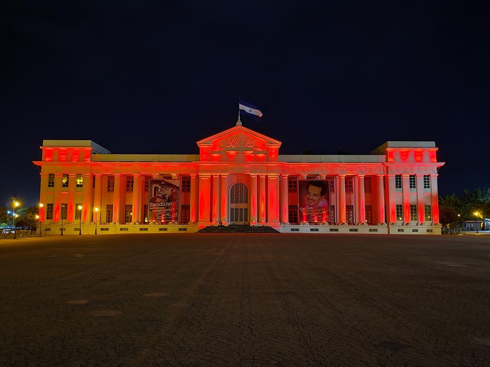 2022年1月31日,尼加拉瓜首都马那瓜市中心标志性建筑国家宫点亮“中国红”。新华社发(中国驻尼加拉瓜使馆供图)