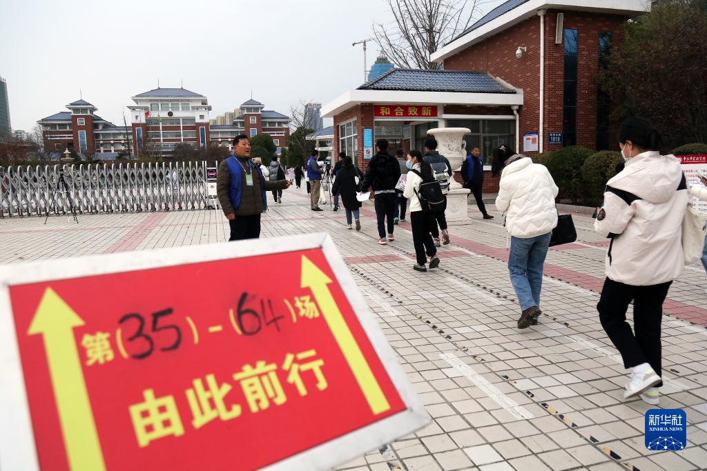 12月10日,考生在山东省枣庄市一考点外排队准备进入考场。
