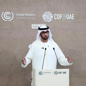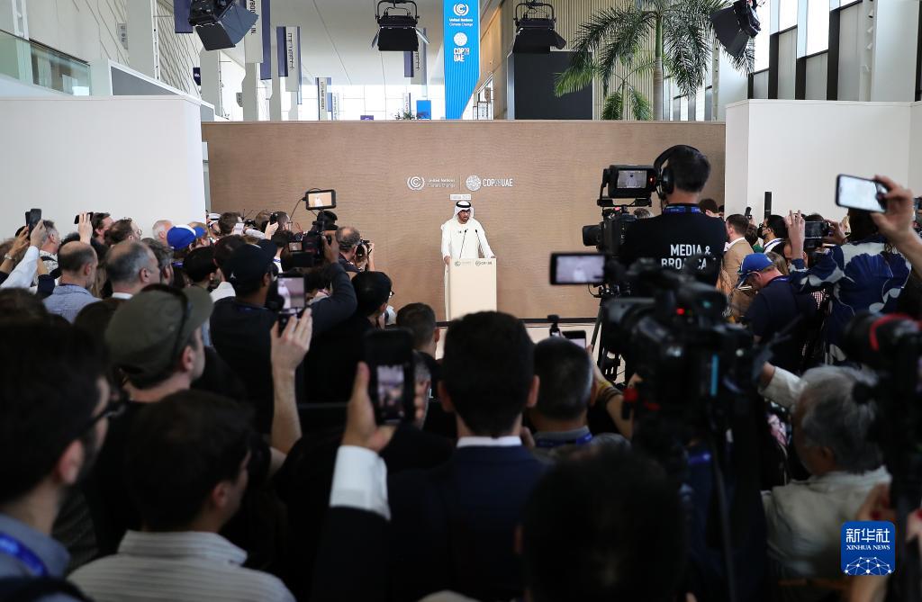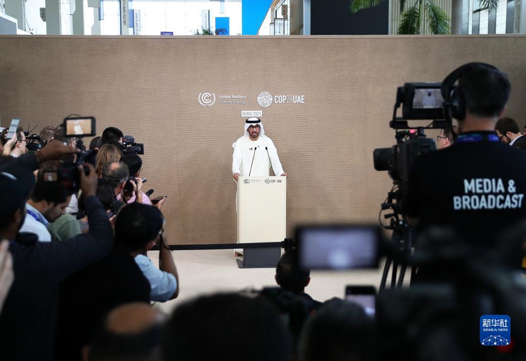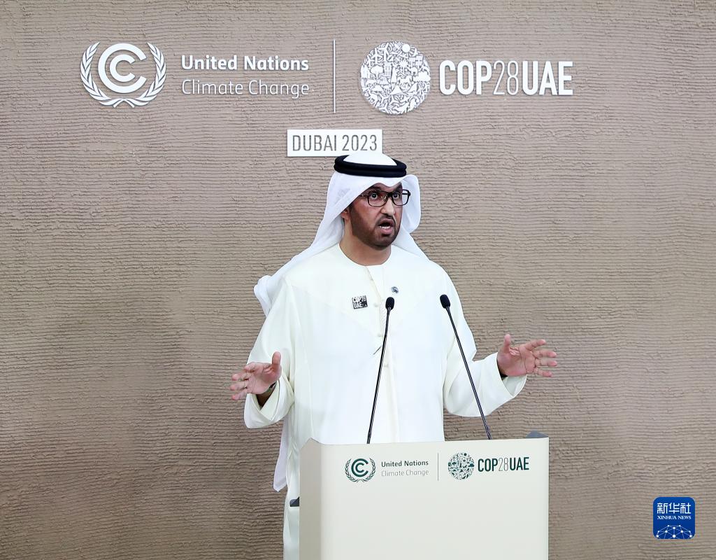 12月10日,在联合国气候变化迪拜大会期间,COP28主席苏尔坦·贾比尔回答记者提问。新华社记者 王东震 摄
