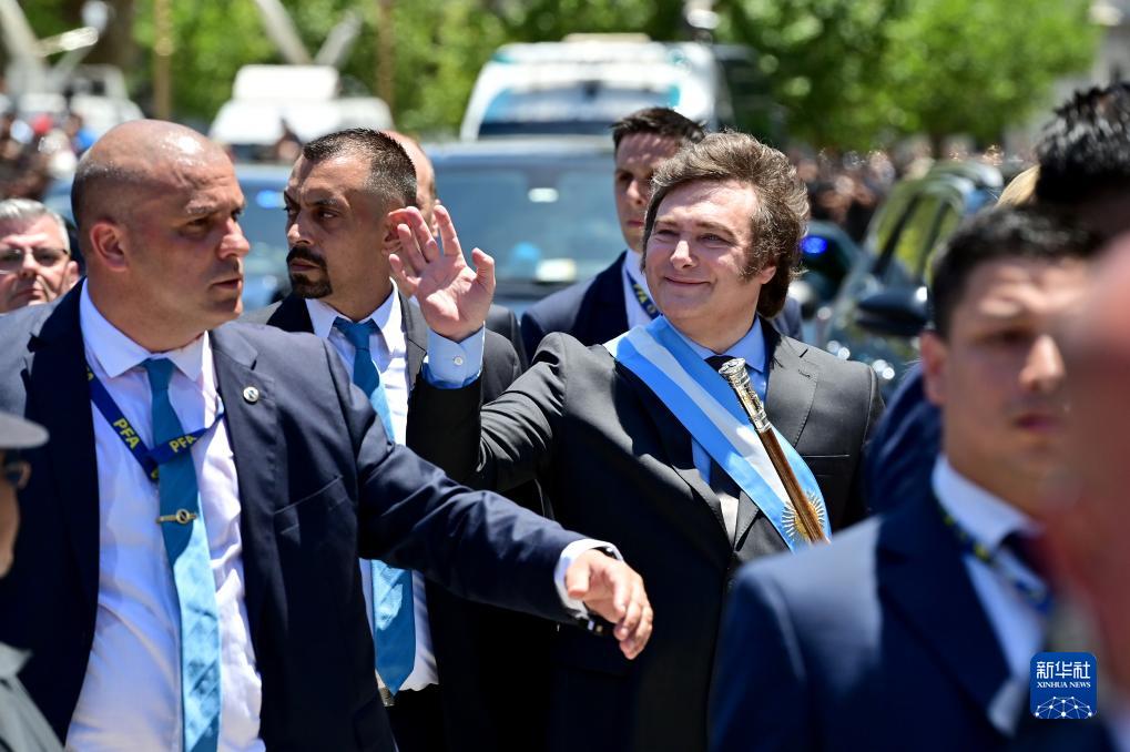 12月10日,在阿根廷首都布宜诺斯艾利斯,阿根廷新总统米莱(中右)在前往总统府玫瑰宫路上向民众致意。新华社发(赫尔曼·阿德拉斯蒂摄)