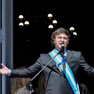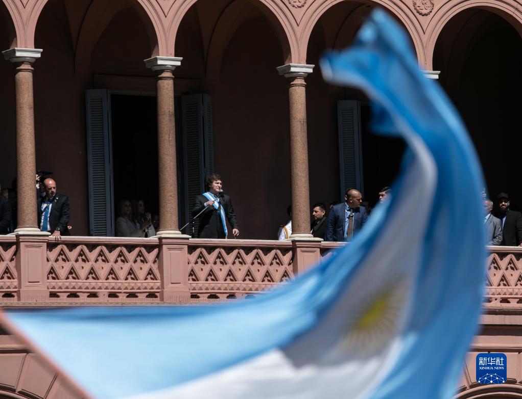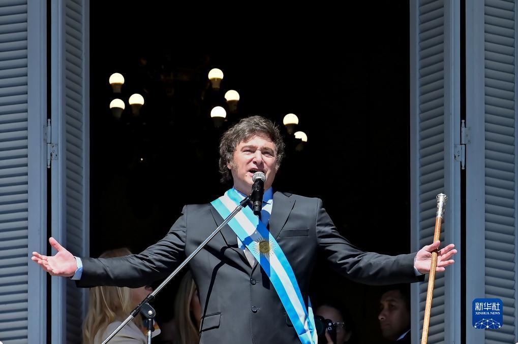 12月10日,在阿根廷首都布宜诺斯艾利斯,阿根廷新总统米莱在总统府玫瑰宫阳台上向民众发表演说。新华社发(赫尔曼·阿德拉斯蒂摄)