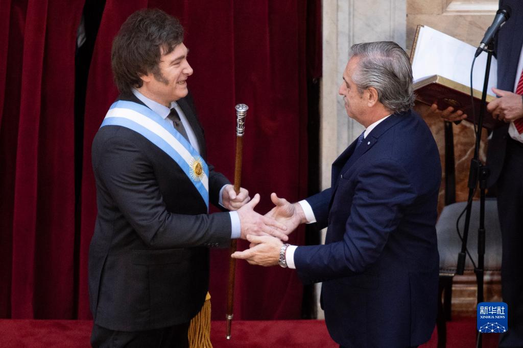 12月10日,在阿根廷首都布宜诺斯艾利斯,阿根廷新总统米莱(左)在阿根廷国会从前任总统费尔南德斯手中接过绶带和权杖。新华社发(马丁·萨巴拉摄)