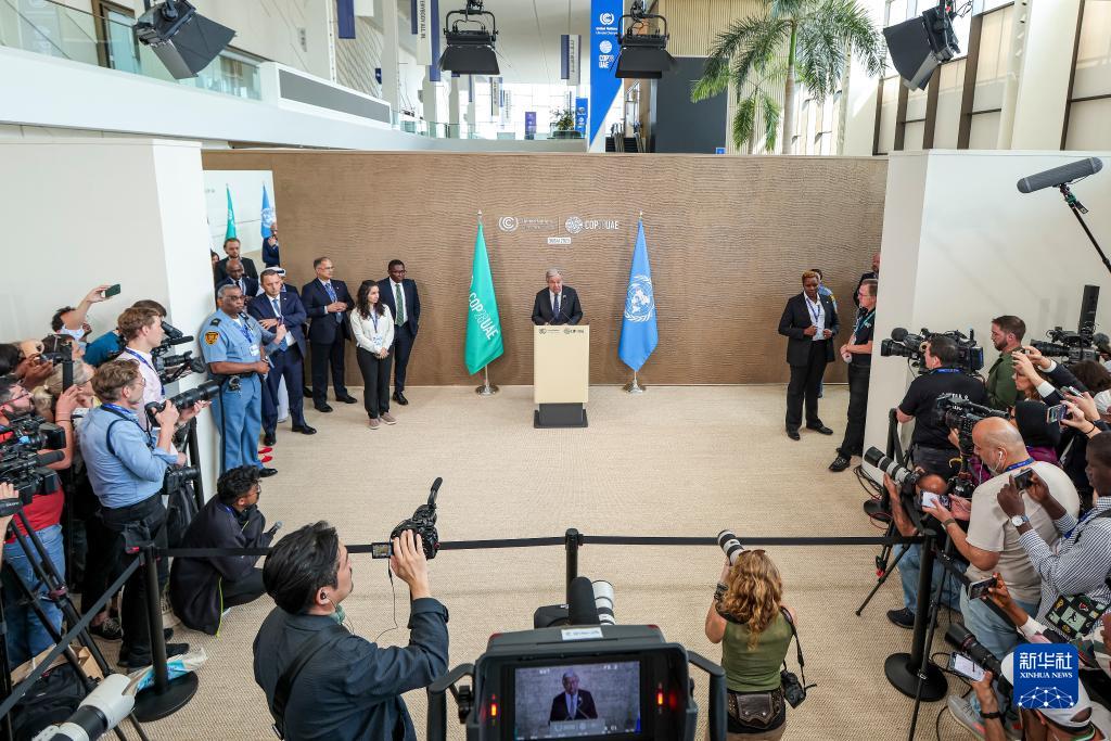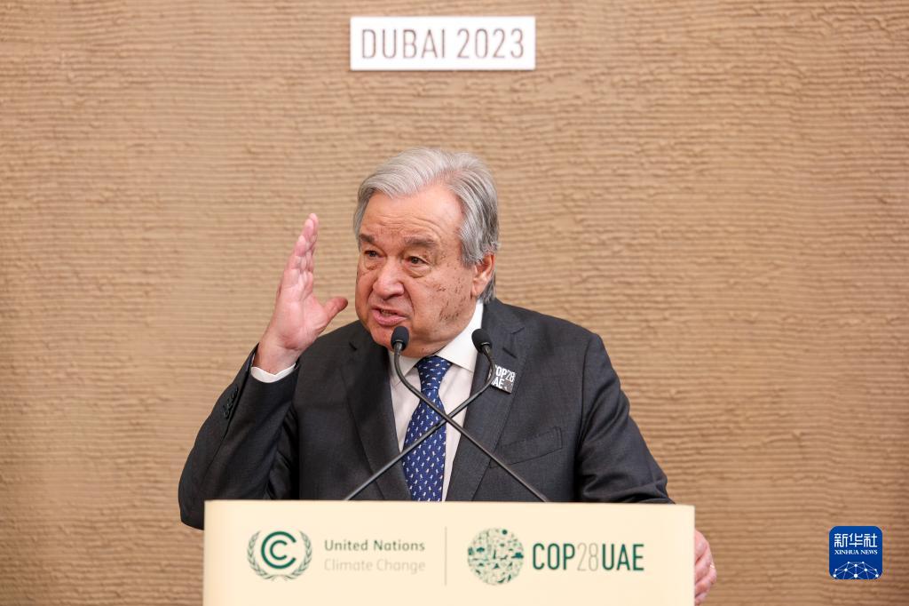 12月11日,在联合国气候变化迪拜大会期间,联合国秘书长古特雷斯在新闻发布会上回答记者提问。新华社发(联合国气候变化迪拜大会供图)