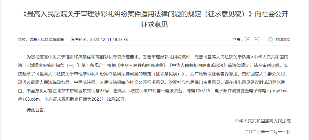 最高法公告称,为广泛听取社会各界意见,更好回应人民群众关切,现通过最高人民法院政务网、中国法院网、人民法院报等向社会公开征求意见,本次征求意见截止日期为2023年12月26日。