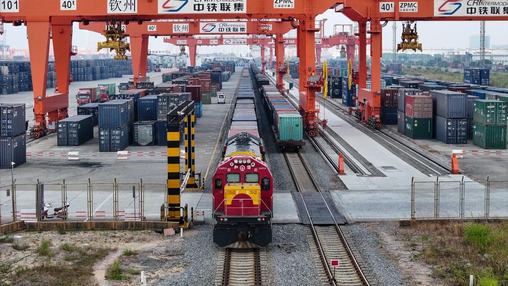 在钦州集装箱中心站,铁海联运班列整装待发(11月24日摄,无人机照片)。(新华社记者张爱林摄)