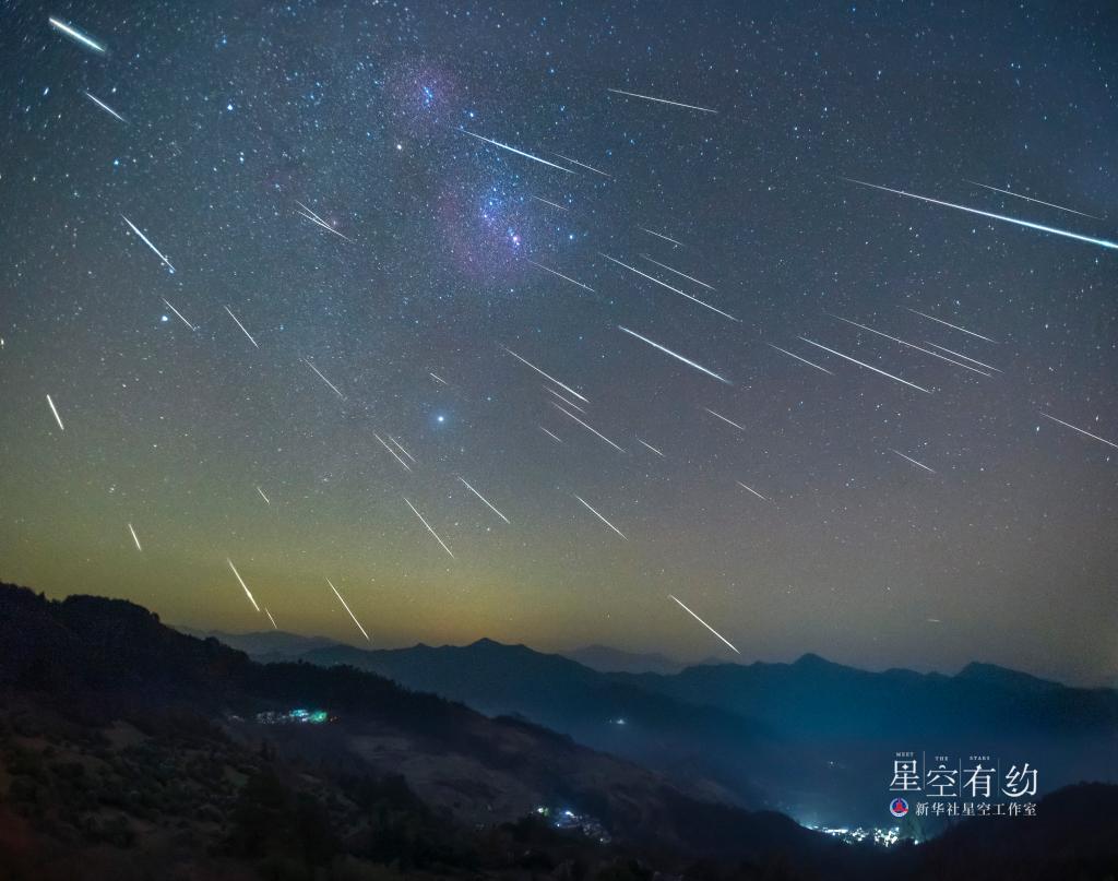 安徽星空摄影爱好者王艺胤2022年12月14日在安徽黄山市歙县石潭村拍摄的双子座流星雨(多张叠加)。(本人供图)