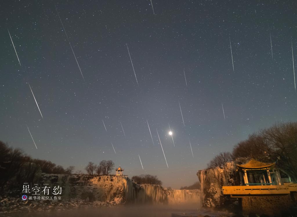 黑龙江星空摄影爱好者王宝勋2022年12月14日在黑龙江牡丹江镜泊湖景区拍摄的双子座流星雨(多张叠加)。(本人供图)