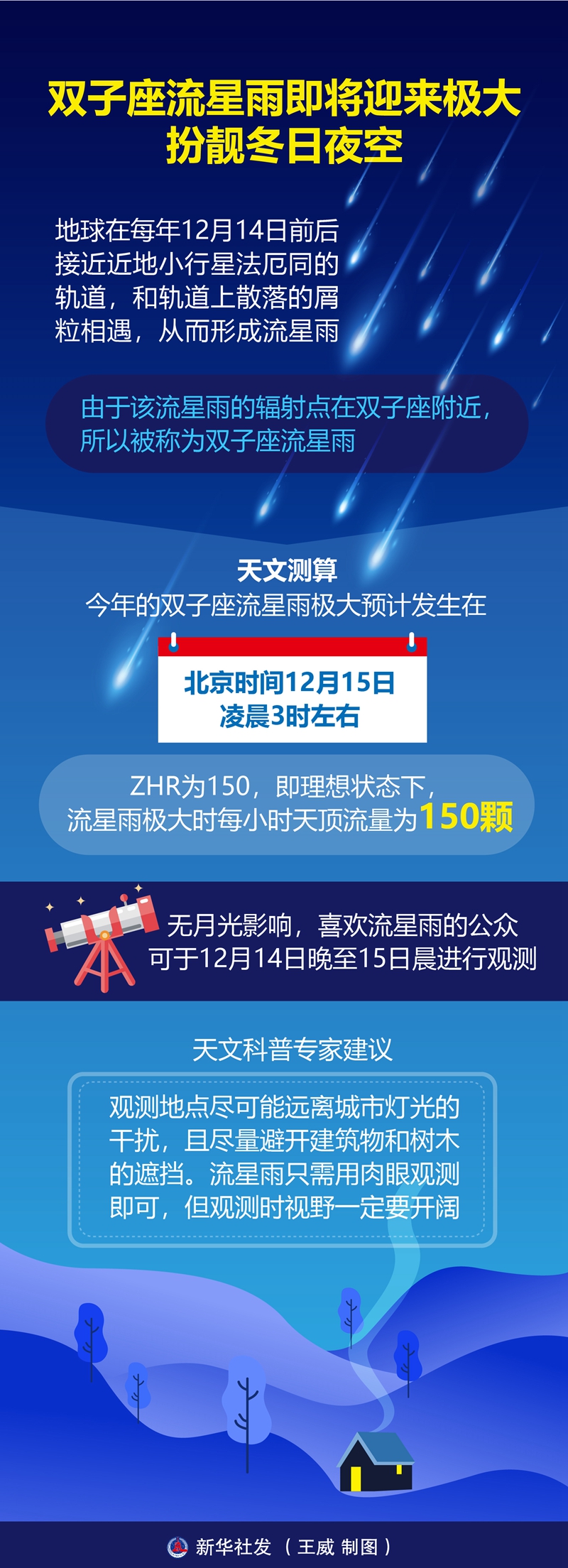 12月中旬,天黑后不久双子座就从东方偏北的地平线上升起。“今年的双子座流星雨不会受到月光影响,观测条件极佳,喜欢流星雨的发烧友14日晚即可守着夜空,有较大的机会看到流星;有毅力的可以坚持到15日凌晨,届时看到的流星数量会更多。”修立鹏说。