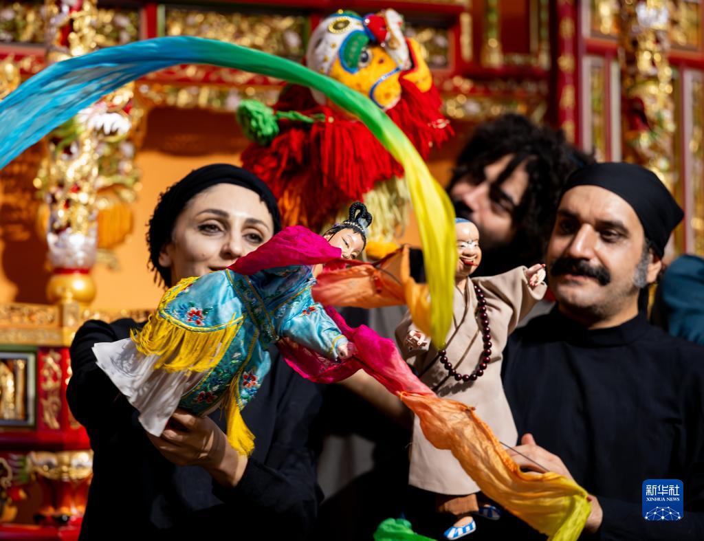 在福建泉州晋江市掌中木偶艺术保护传承中心,法希玛·巴罗奇与晋江市掌中木偶艺术保护传承中心演出队队长、市级非遗传承人陈代宫一见如故,两名中外艺术家台上台下交流互鉴,相互学习表演技艺。