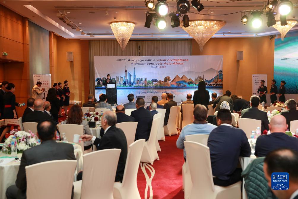 这是12月11日在埃及开罗拍摄的推介仪式现场。搭载232名旅客的中国东方航空MU223航班从上海浦东国际机场起飞,于埃及当地时间11日早间飞抵开罗机场。当晚,东航在埃及首都开罗举办首航推介仪式。新华社记者 隋先凯 摄
