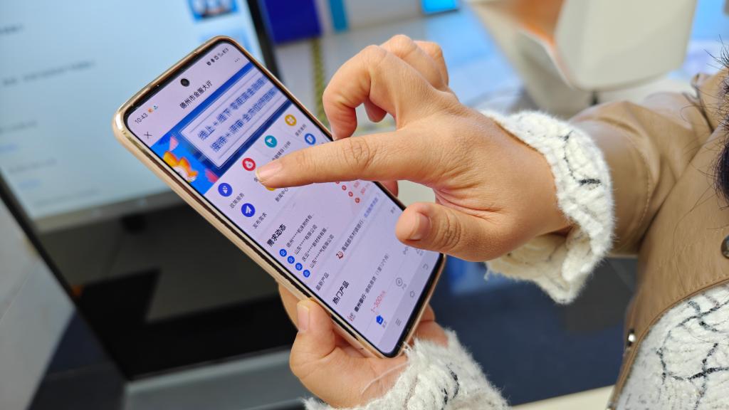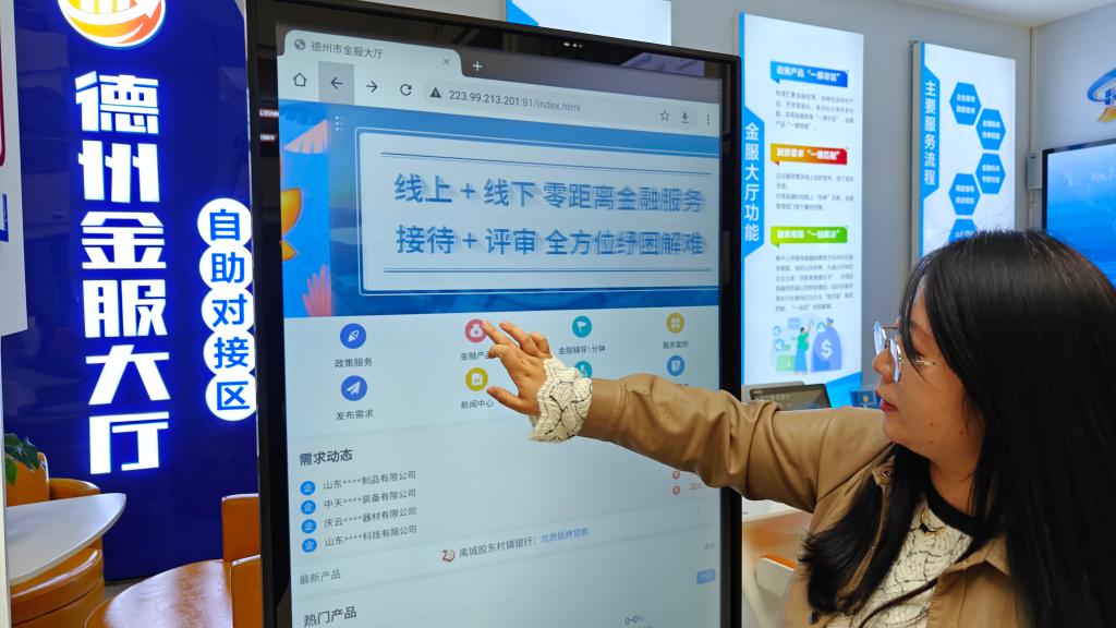 工作人员正在展示德州金服大厅的线上服务平台。新华社记者萧海川 摄