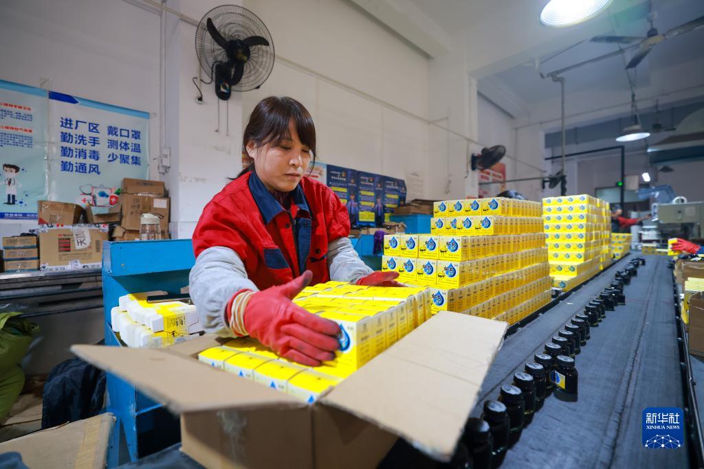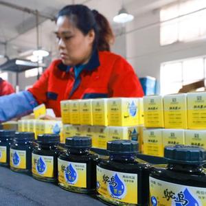 12月12日,在天津市鸵鸟墨水有限公司生产车间,工人将生产好的“鸵鸟”墨水进行包装。