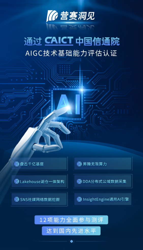 为进一步促进大模型快速发展,中国信通院联合产学研用各界发布可信AI大模型标准体系2.0,为科学评价大模型技术能力和应用效能提供了详尽参考。在此次参测的可信AIGC服务能力项目中,营赛洞见在生成能力、平台能力、场景能力的三大类指标评估中均展现出了领先实力。