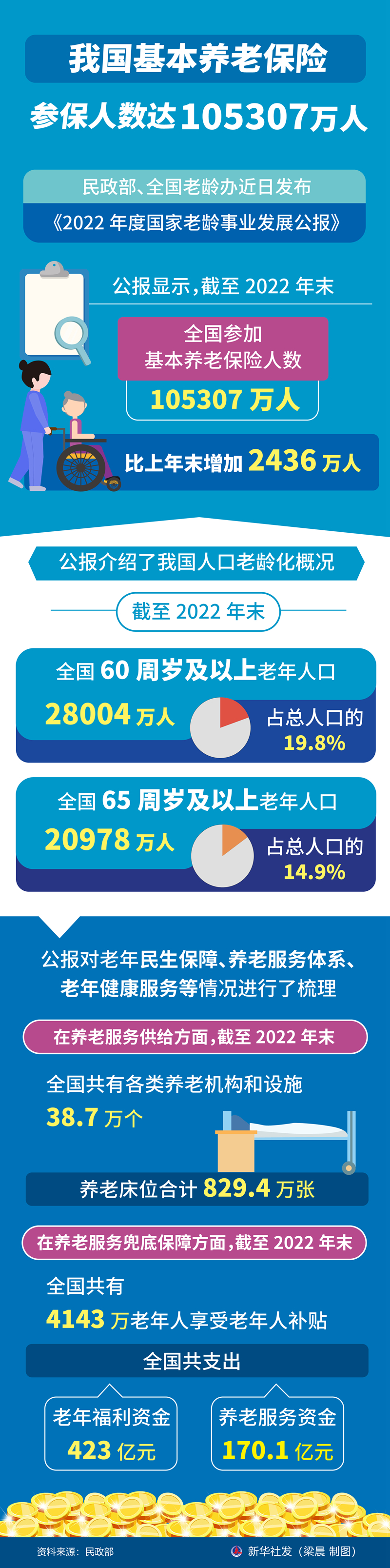 新华社北京12月14日电(记者高蕾)记者14日从民政部获悉,民政部、全国老龄办近日发布《2022年度国家老龄事业发展公报》。公报显示,截至2022年末,全国参加基本养老保险人数105307万人,比上年末增加2436万人。