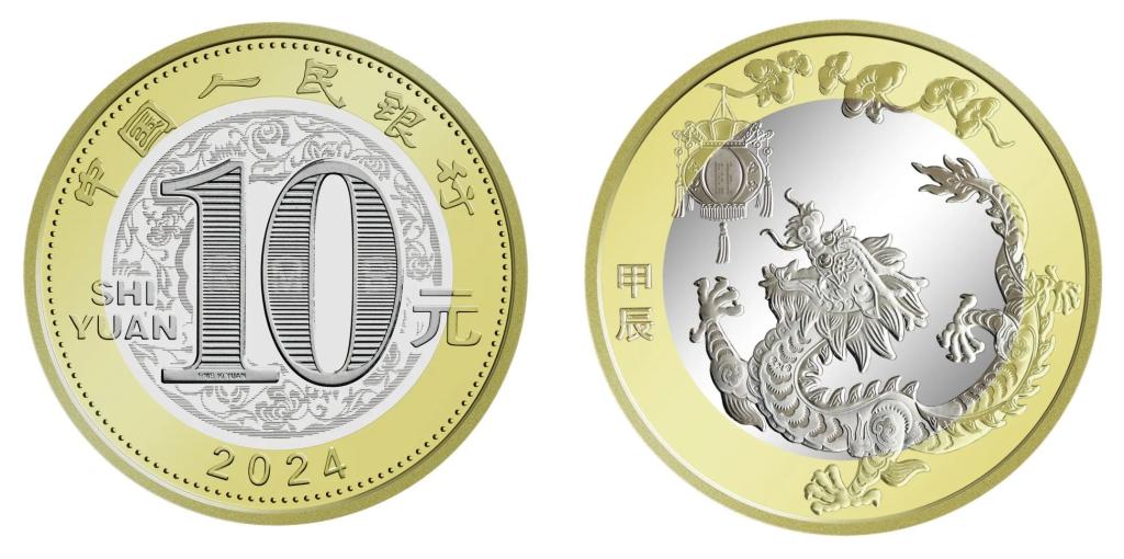 双色铜合金纪念币正面图案为“中国人民银行”“10元”字样,汉语拼音字母“SHIYUAN”及年号“2024”,底纹衬以团花图案。背面图案为中国传统剪纸艺术与装饰年画元素相结合的龙形象,衬以花灯和灵芝,币面左侧刊“甲辰”字样。双色铜合金纪念币面额10元,发行数量1.2亿枚。