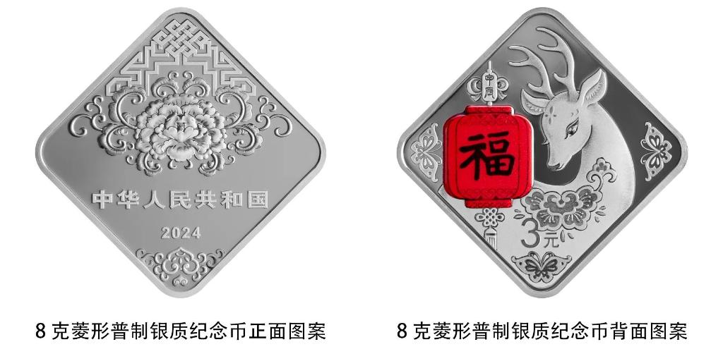 8克菱形银质纪念币背面图案为“福”字、灯笼、鹿、蝴蝶等装饰组合设计,并刊面额,最大发行量1500000枚。