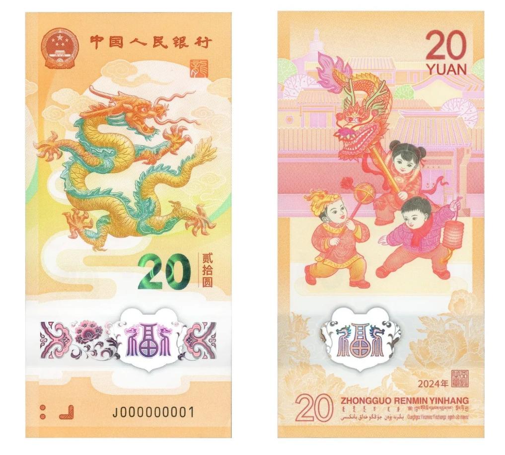 纪念钞背面主景为儿童舞龙灯图案,辅以北京四合院民居装饰图案,上方为面额数字“20”、汉语拼音字母“YUAN”,下方为花卉与动感全息图案、年号“2024年”、行长章、面额数字“20”、“中国人民银行”汉语拼音和蒙、藏、维、壮四种民族文字的“中国人民银行 贰拾圆”字样。纪念钞面额20元,采用塑料材质,发行数量1亿张。