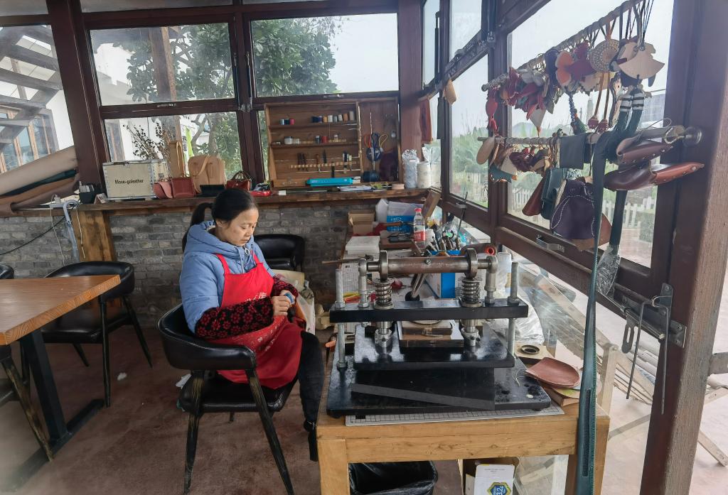 今年50岁的村民甘遐学曾在皮鞋厂工作,随着艺术院落建成,她留在家乡工作,还拾起在皮鞋厂工作的老本行,成为一名“皮革艺人”。