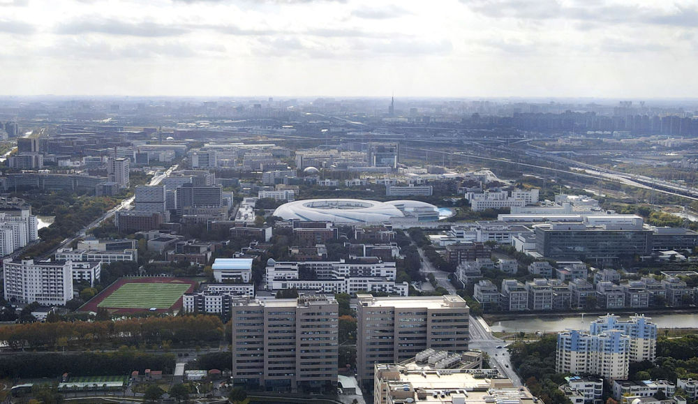 这是2023年11月25日在上海浦东新区张江科学城拍摄的形如鹦鹉螺的大科学装置上海光源(中)(无人机照片)。新华社记者 方喆 摄