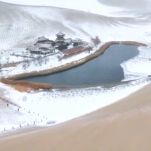 12月14日,位于甘肃省敦煌市的鸣沙山月牙泉景区迎来一场降雪。昔日沙泉共生、金沙碧波的鸣沙山与月牙泉“邂逅”皑皑白雪,连同岸边的芦苇荡和古建楼阁,构成一幅宁谧而优美的画卷。游客纷纷打卡拍照,收藏这份难得一见的“冰雪奇缘”。