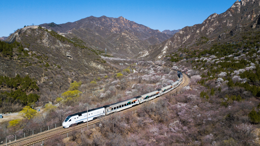 一列火车在北京居庸关长城附近的山花中穿行。新华社记者鞠焕宗 摄