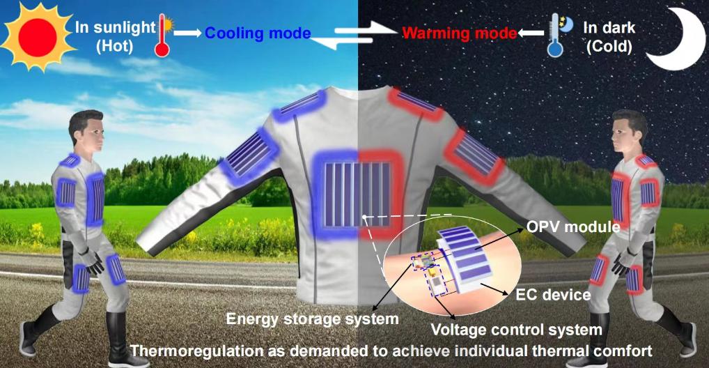 南开大学团队设计、制备的这种柔性且可持续的个人体温调节衣物系统,能够根据各种极端复杂的环境温度变化快速响应,通过柔性太阳能器件,将太阳光的能量用于驱动高效的电卡热管理器件,使人体热舒适区从22摄氏度至28摄氏度扩展到12.5摄氏度至37.6摄氏度,具有能耗低、效率高的特点,只需12小时的太阳光能量输入,便可实现24小时可控和双模式体温调节。