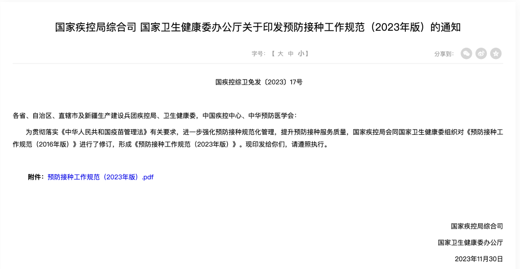 根据国家疾控局发布的通知,此次印发的新版预防接种工作规范是贯彻落实《中华人民共和国疫苗管理法》有关要求,对《预防接种工作规范(2016年版)》进行修订后形成的。