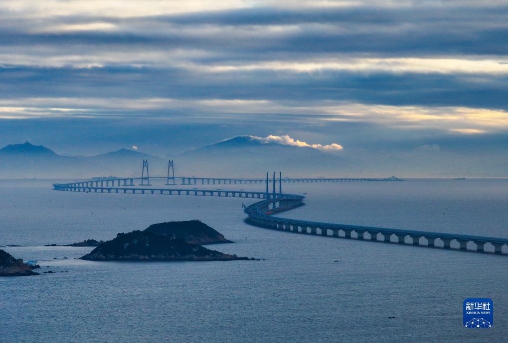 晨曦中的港珠澳大桥(12月15日摄,无人机照片)。新华社记者 刘大伟 摄