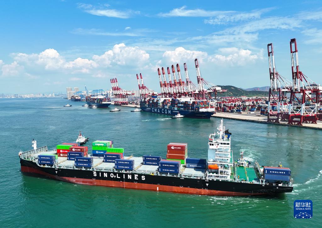 一艘货轮缓缓驶离山东港口青岛港(无人机照片,2023年8月30日摄)。新华社发(张进刚 摄)