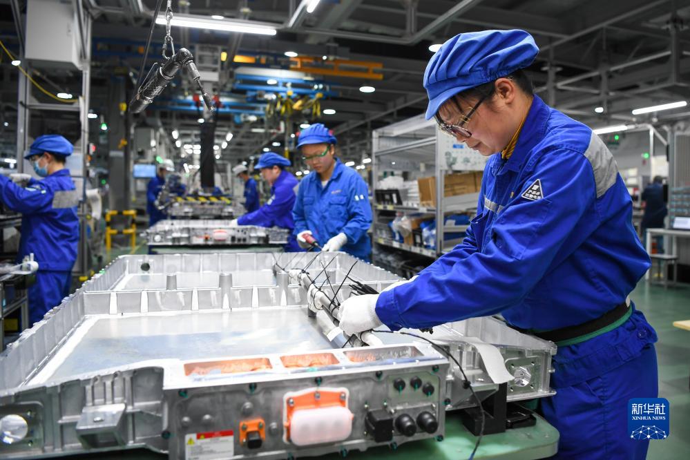 在位于江苏常州溧阳的上汽时代动力电池系统有限公司,工人在车间进行电池生产(2023年2月16日摄)。新华社记者 李博 摄