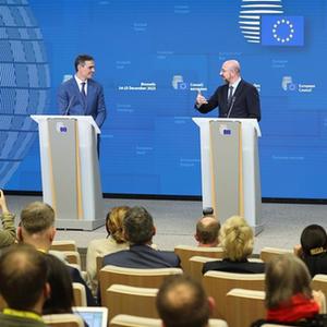12月15日,在比利时布鲁塞尔,欧洲理事会主席米歇尔在欧盟峰会期间主持召开新闻发布会。新华社记者 赵丁喆 摄