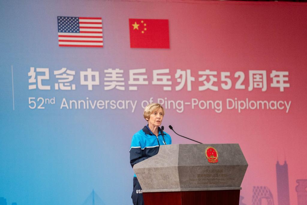 12月13日,在美国首都华盛顿,1971年首次访华球员康妮·史维利斯在中美“乒乓外交”52周年纪念活动上致辞。(新华社记者刘杰摄)