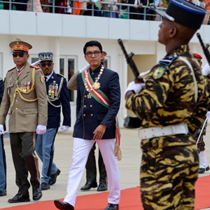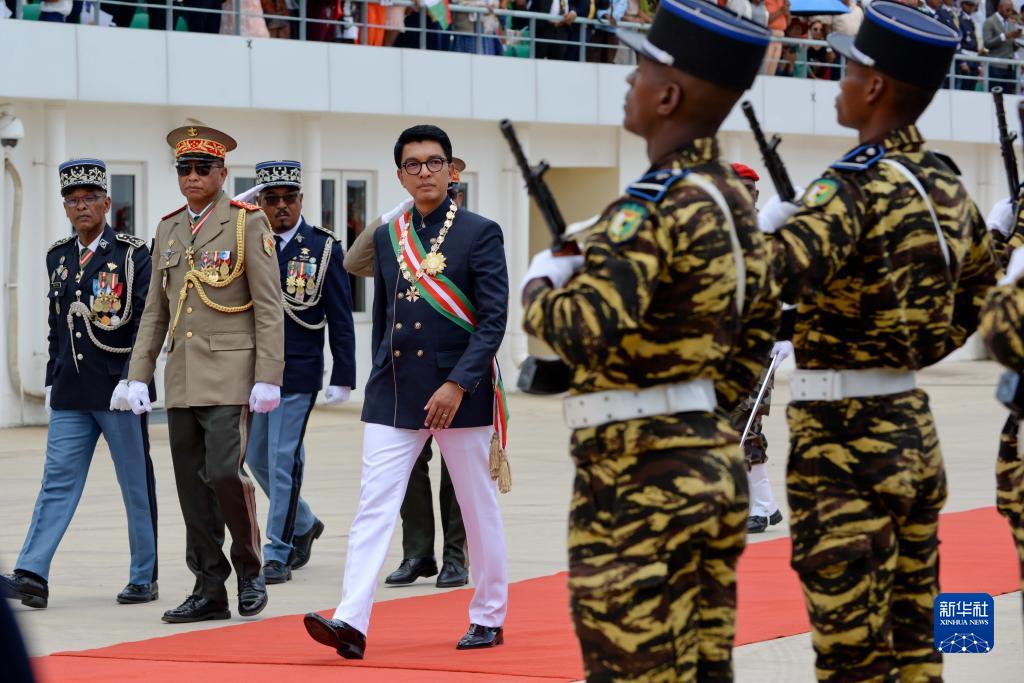 12月16日,在马达加斯加首都塔那那利佛,马达加斯加总统拉乔利纳(中)在就职典礼现场检阅军队。新华社发(西塔卡·拉乔纳里松摄)