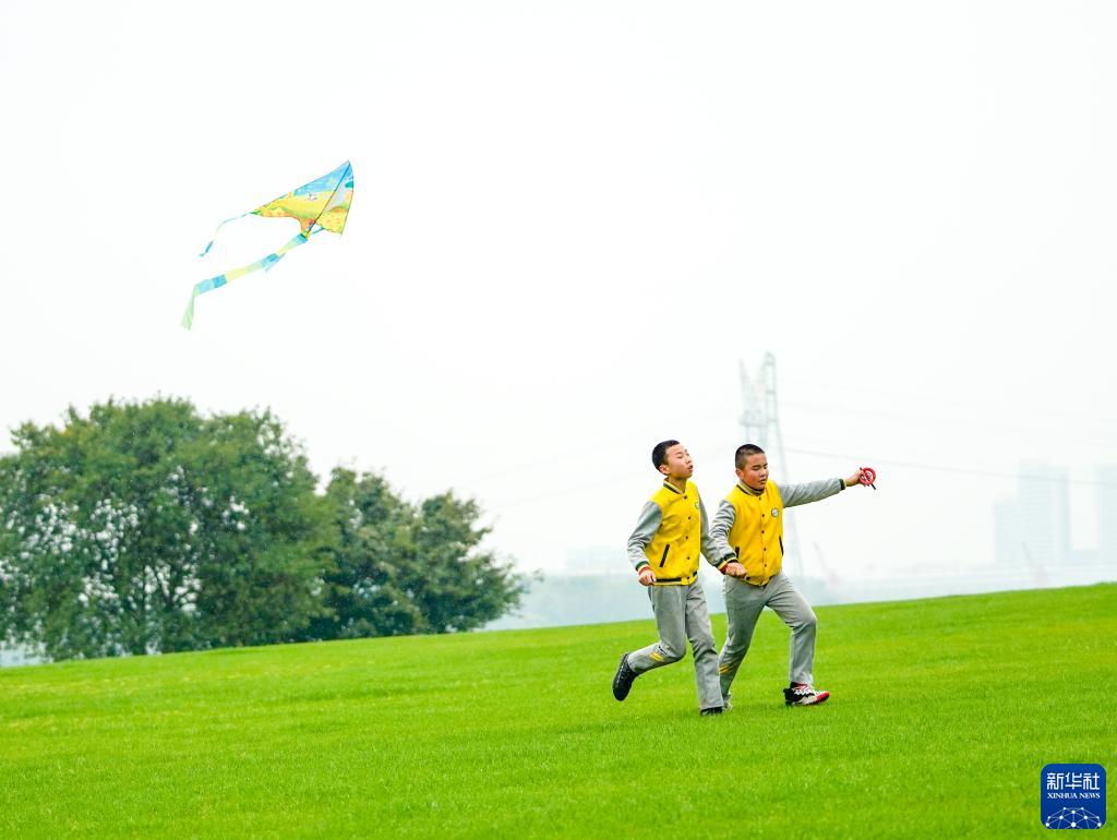 3月31日,在重庆市广阳岛的一片草地上,两名重庆市特殊教育中心视力障碍学生牵着手放风筝。