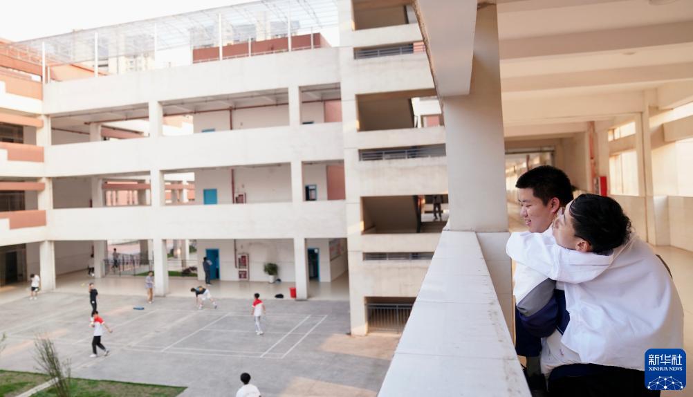 4月12日,在位于江西省赣州市的南康中学北校区,朱金祥背着患有先天性脑瘫的同学钟华强在学校走廊内看其他同学打球。