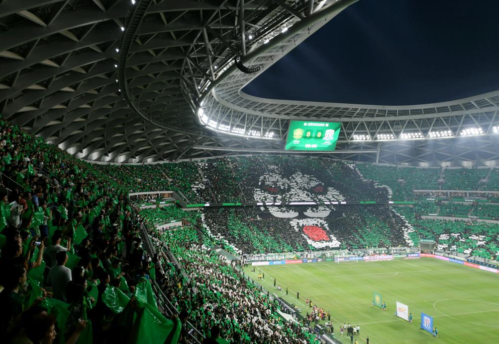 8月19日,球迷在现场摆出北京国安队的雄狮图案。新华社记者 张晨霖 摄