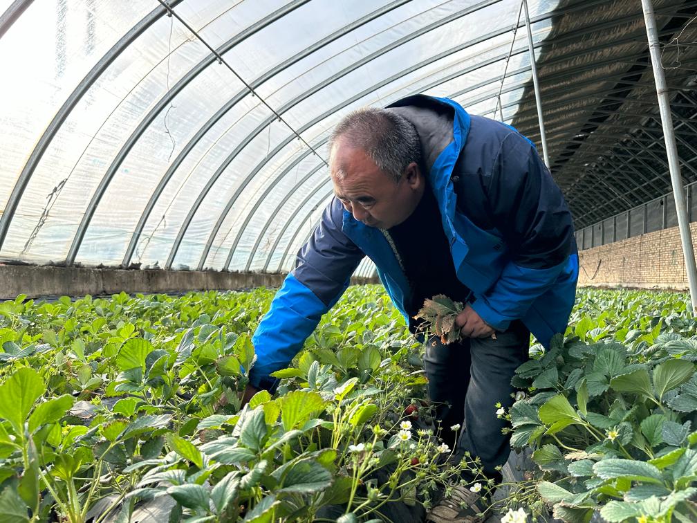 一场降雪后,青海省西宁市湟中区多巴镇玉拉村披上一层雪白的外衣。55岁的王永生一早就进了大棚,田埂上鲜红饱满的草莓长势喜人,枝叶间点缀着朵朵白色小花。