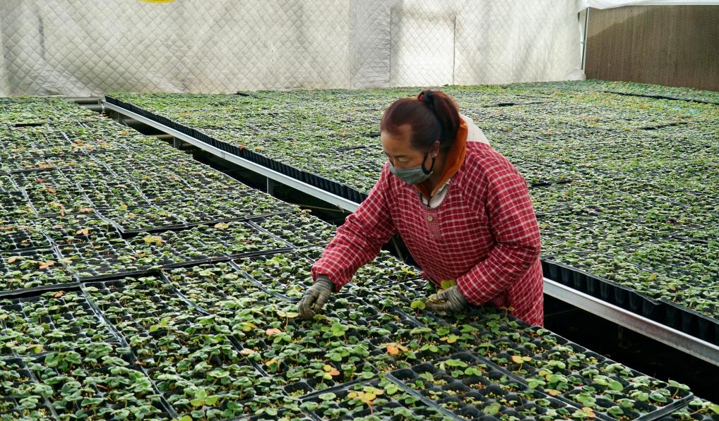 12月15日,在青海省西宁市湟中区多巴镇玉拉村草莓脱毒繁育中心,村民在给育苗除草。(新华社记者 张子琪 摄)