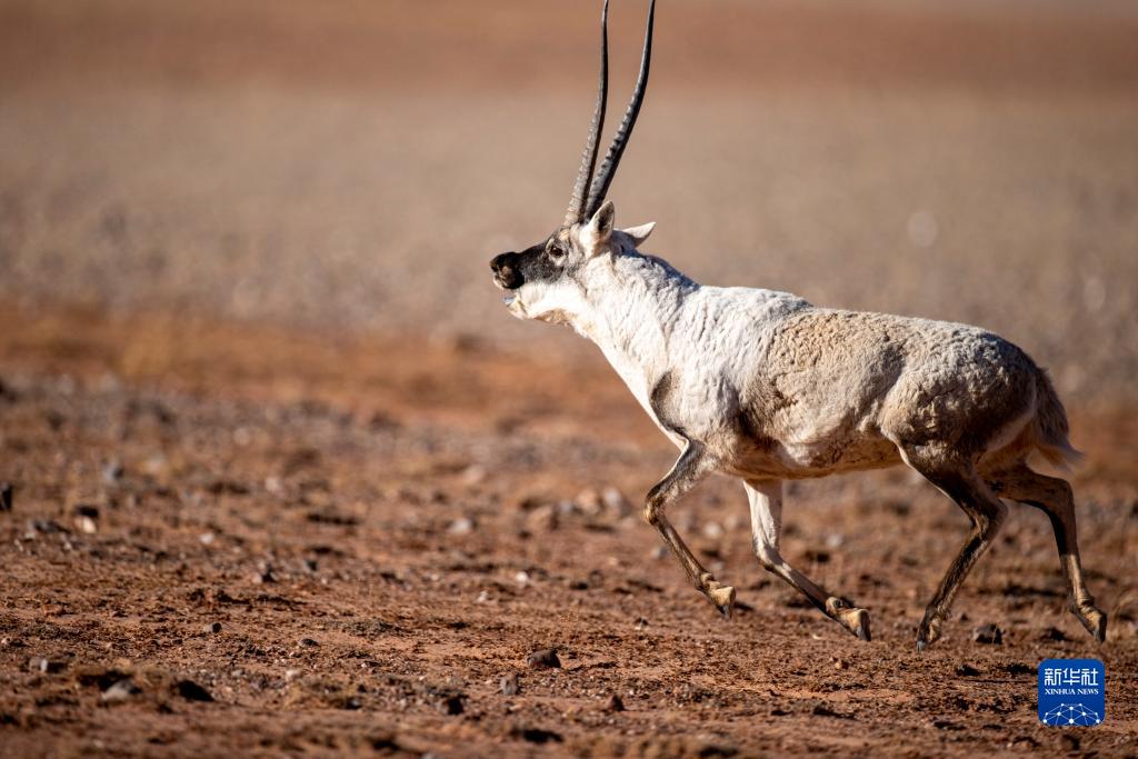 在羌塘国家级自然保护区,一只雄性藏羚羊在奔跑(12月17日摄)。